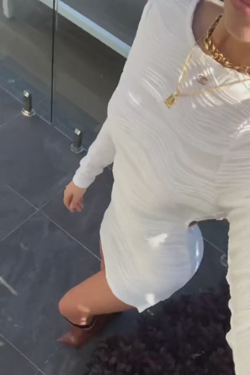 Notre mini-robe Kirra présente une coupe courte avec un col montant et des manches longues, confectionnée dans un tissu texturé. Ce modèle présente un dos nu avec une bretelle à l'arrière du cou et de petites fentes de chaque côté de l'ourlet. Ce vêtement est non doublé, légèrement transparent et légèrement extensible. Tissu : 95 % polyester et 5 % élasthanne. Veuillez consulter l'étiquette d'entretien pour les instructions d'entretien.